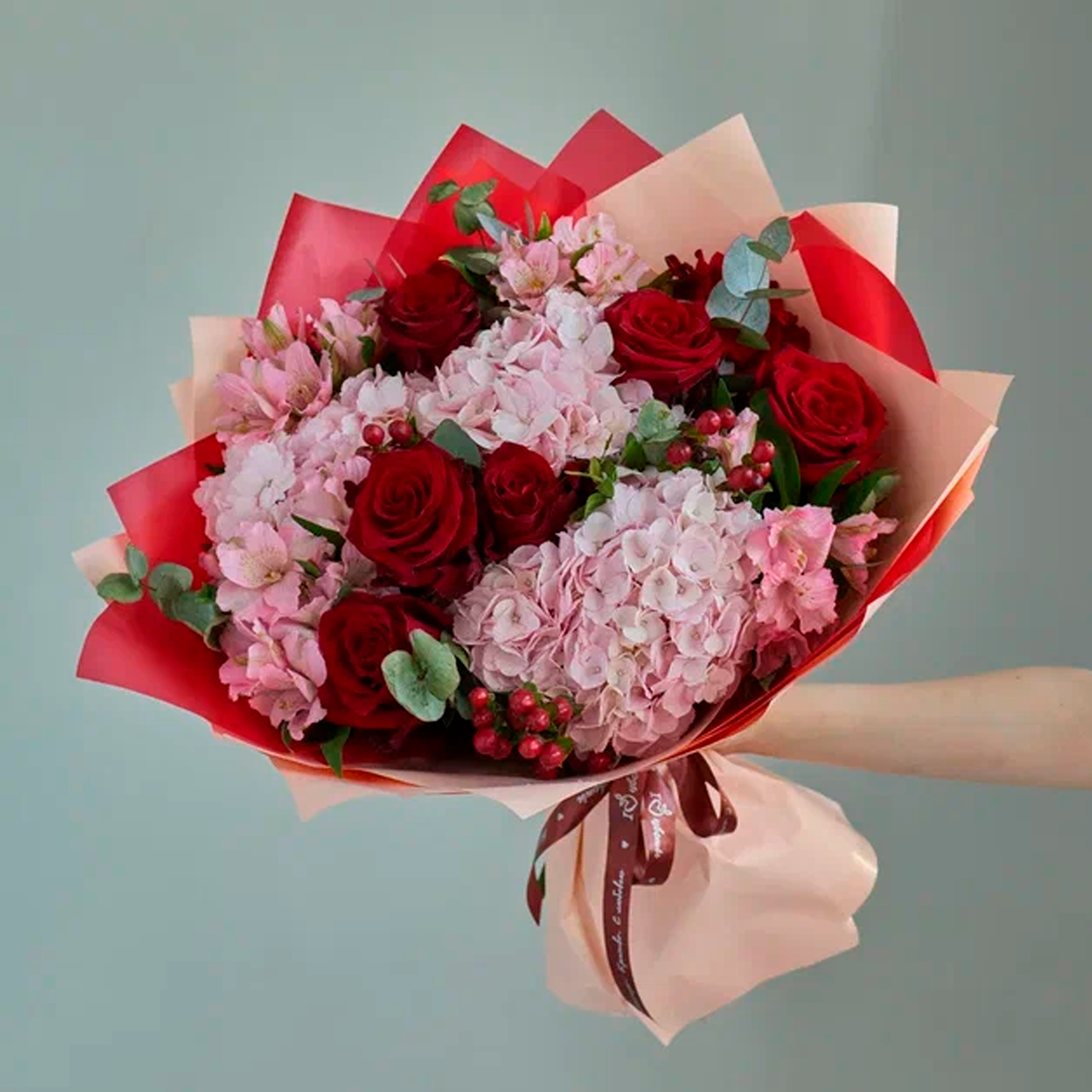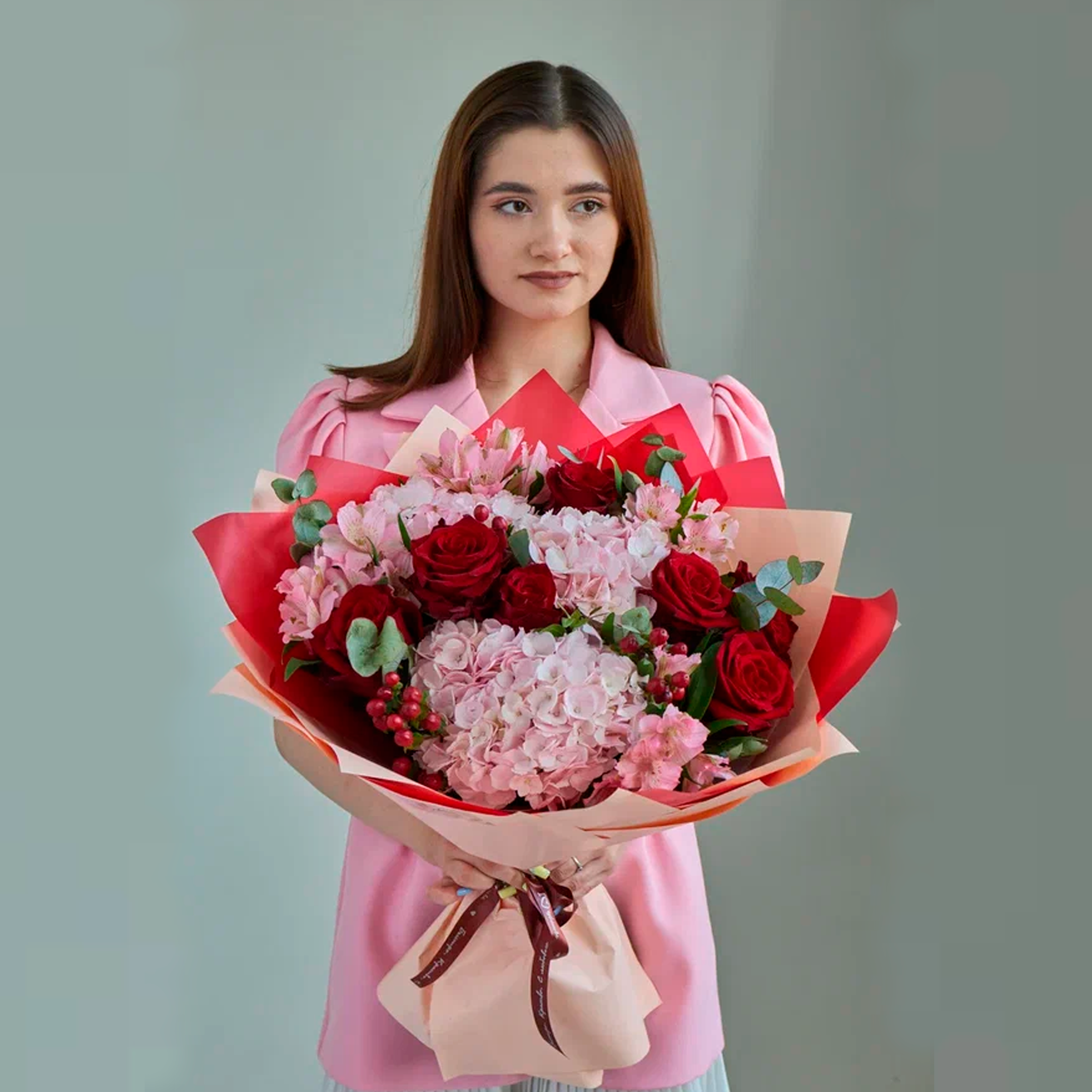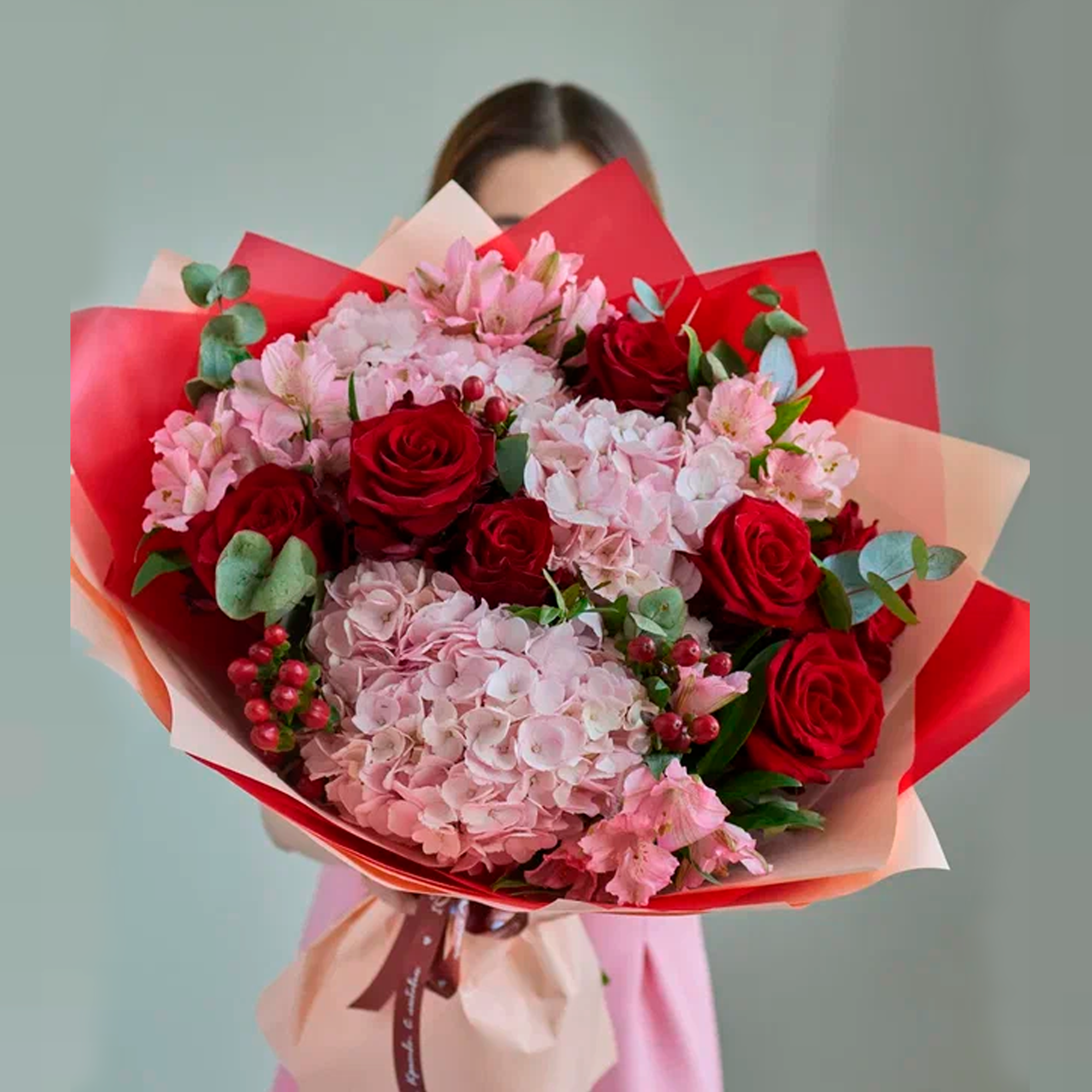 Такой большой букет станет достойным выбором для юбилея, выпускного или в качестве букета от класса на 1 сентября. Гармония насыщенных и нежных тонов подчёркивает значимость момента и передаёт уважение адресату. Эта композиция уместна как в официальной обстановке, так и в тёплой праздничной атмосфере.