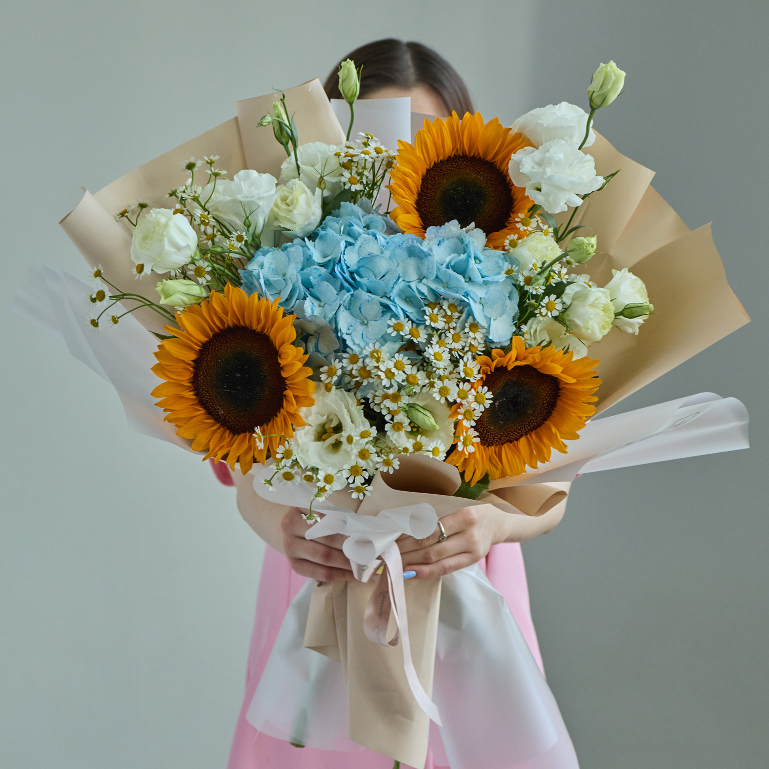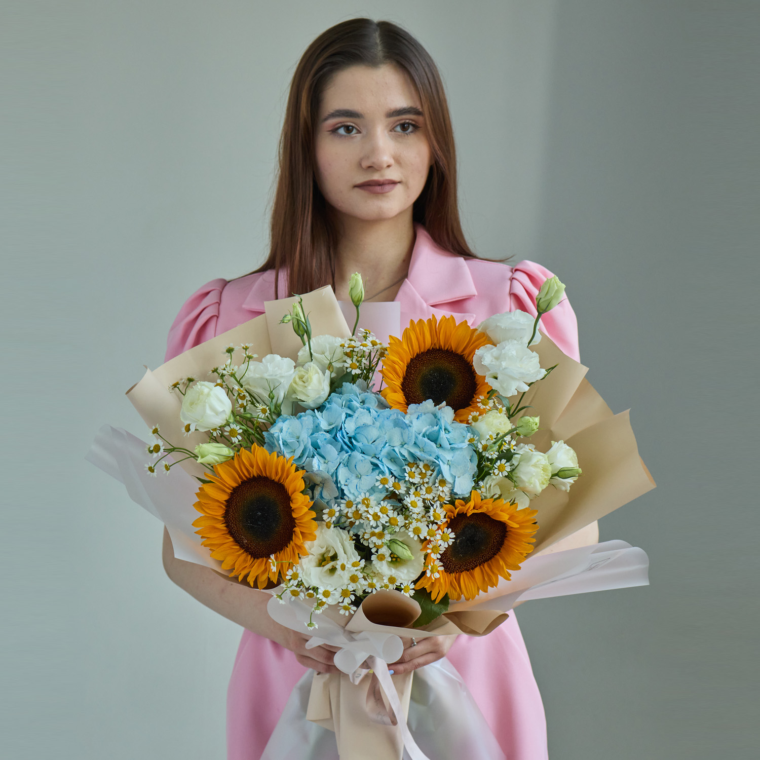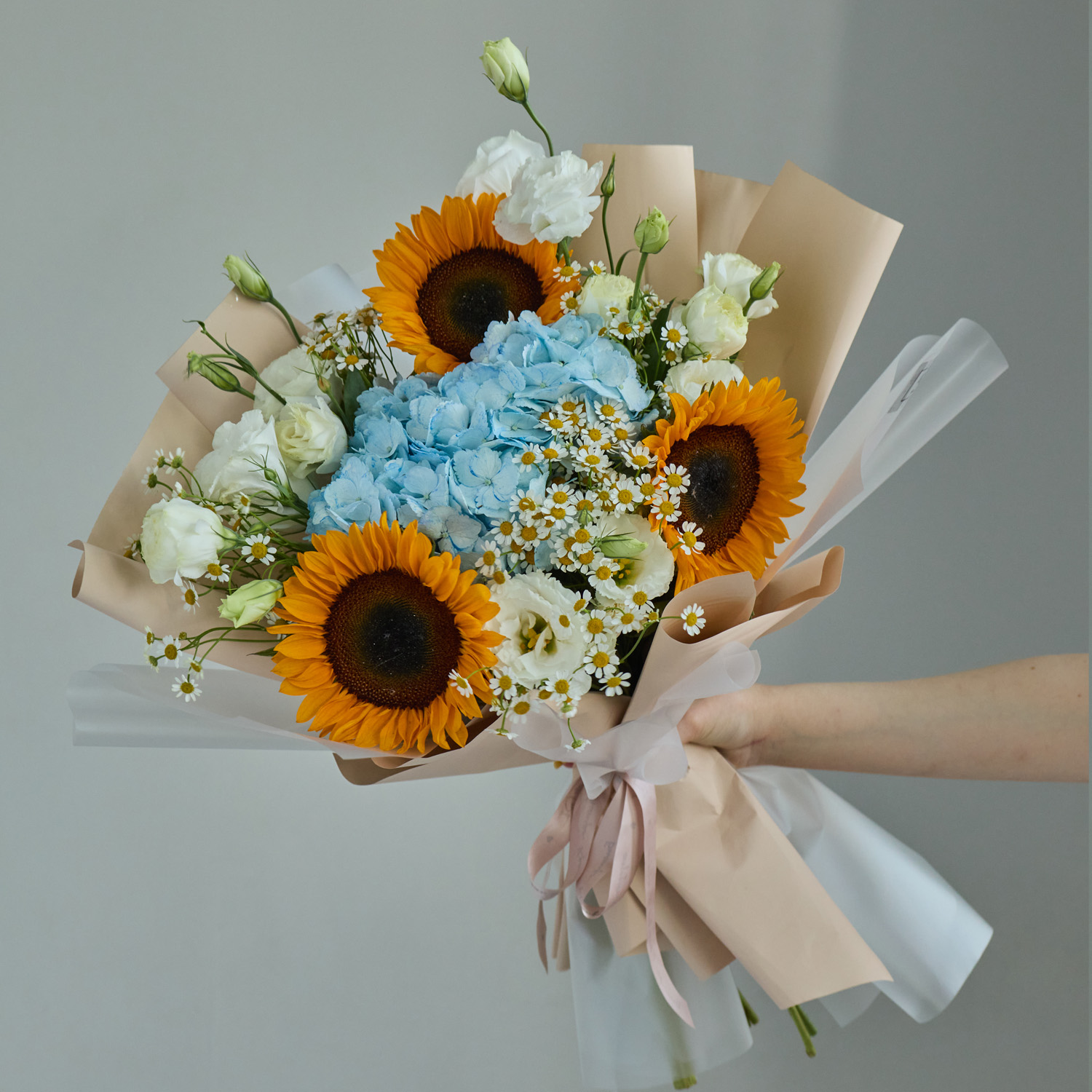 Такой авторский букет станет достойным подарком и от класса, и для индивидуального поздравления. Подойдёт для поздравления учителя на 1 сентября, последний звонок или выпускной. Он уместен для старшеклассников, когда хочется подчеркнуть особый статус и выразить уважение. Композиция наполнена энергией и символикой: подсолнухи — про радость и тепло, гортензия — про искренность и благодарность.